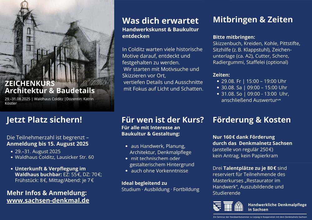Der nächster Zeichenkurs "Architektur & Baudetails "ist vorgeplant im Waldhaus Colditz als Blockwochenende vom 29.-31.8.2025. Drei Tage räumliches Zeichen, Erfassen von Details, Skizzieren im historischen Umfeld der Stadt Colditz.