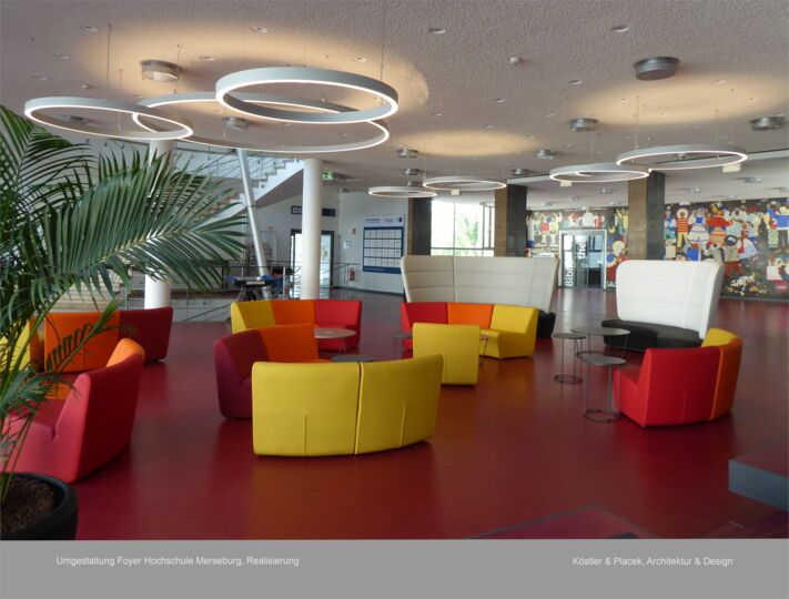 Das denkmalgeschützte Foyer soll den neuen Anforderungen der Studierenden angepasst werden. In Zukunft soll nun das Bibliotheksfoyer mit seinem Platz auch einladen zum Arbeiten, Nachdenken, Austauschen der Studenten, auch Fachübergreifend. Dafür entwarfen wir eine gestufte Podestlandschaft zum Sitzen, die zum Verweilen einladen soll. Die große Rückwand soll ab nun multimedial bespielt werden. Sie hat eine Projektionsfläche aus einem nachhaltigem recyceltem Material erhalten, das nun bei Veranstaltungen und Vorträgen bespielt werden kann. Wir verwendeten Materialien, die zu dem bestehenden und denkmalgeschützten Wandbild passen, dieses würdigen und in die neue Gestaltung einbinden. Langlebige Materialien, die auch im Altern ihre Würde behalten, wie Linoleum, sind zum Einsatz gekommen, aber auch Rohstoffe, die aus recycelten Materialien wie PE Flaschen gewonnen werden. Die Farben aus dem bestehenden Wandbild sollten durch unseren Entwurf nun in den Raum wachsen. Hierbei ist eine farbige Vielfalt aus beweglichen Sitzelementen entstanden, die zu verschiedensten Nutzungsvarianten neue Aufstellung finden können. Durch das neue Beleuchtungskonzept konnten wir für das Foyer jeweils nach geplanter Nutzung neue Licht-Szenen gestalten. Diese Grundidee respektiert das vorhandene Wandbild von Hans Rothe in Scagliola-Technik von 1964, das aus Denkmalschutzgründen komplett erhalten blieb. Gemeinsam mit der Hochschule und den Studierenden wurden die Vorschäge zur Gestaltung, zu material und Farbwahl diskutiert und auf die Wünsche der Nutzer:innen angepasst. Entstanden ist ein Gesamtensemble, dass die aktuellen Bedürfnisse der Jugend zur Nutzung der Freiflächen für Kommunikation, Veranstaltungen, Lernen, Vorbereiten, Chillen mit den Möglichkeiten des Bestandsgebäudes vereint.