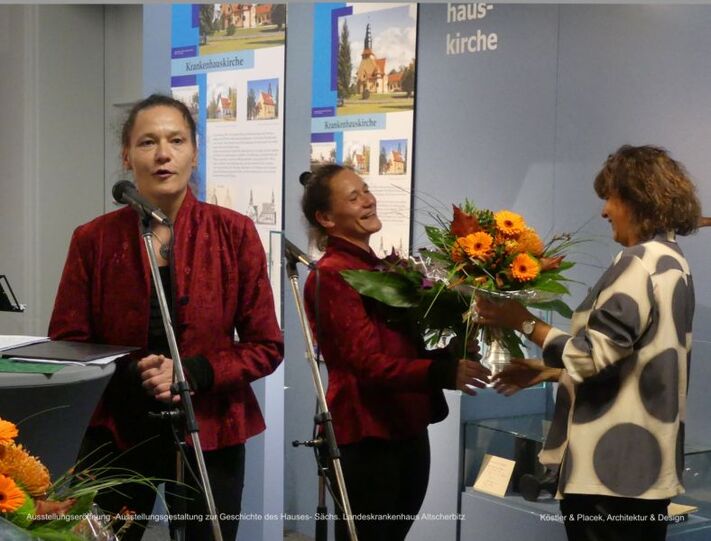 Bild von der Eröffnung der Ausstellungsgestaltung zur Geschichtes des Krankenhauses. Übertragen wurde uns die Konzeption und Gestaltung der Ausstellungsräume von der Idee bis zur Ausführung. Im Rahmen dieser Ausstellung erstellten wir themenbezogene Grafiken und Grafik-tafeln zur Erläuterung der vielen Ausstellungsstücke. Die Inhalte erarbeiteten die Mitarbeiter des sächs. Krankenhauses Altscherbitz und findet großen Anklang.